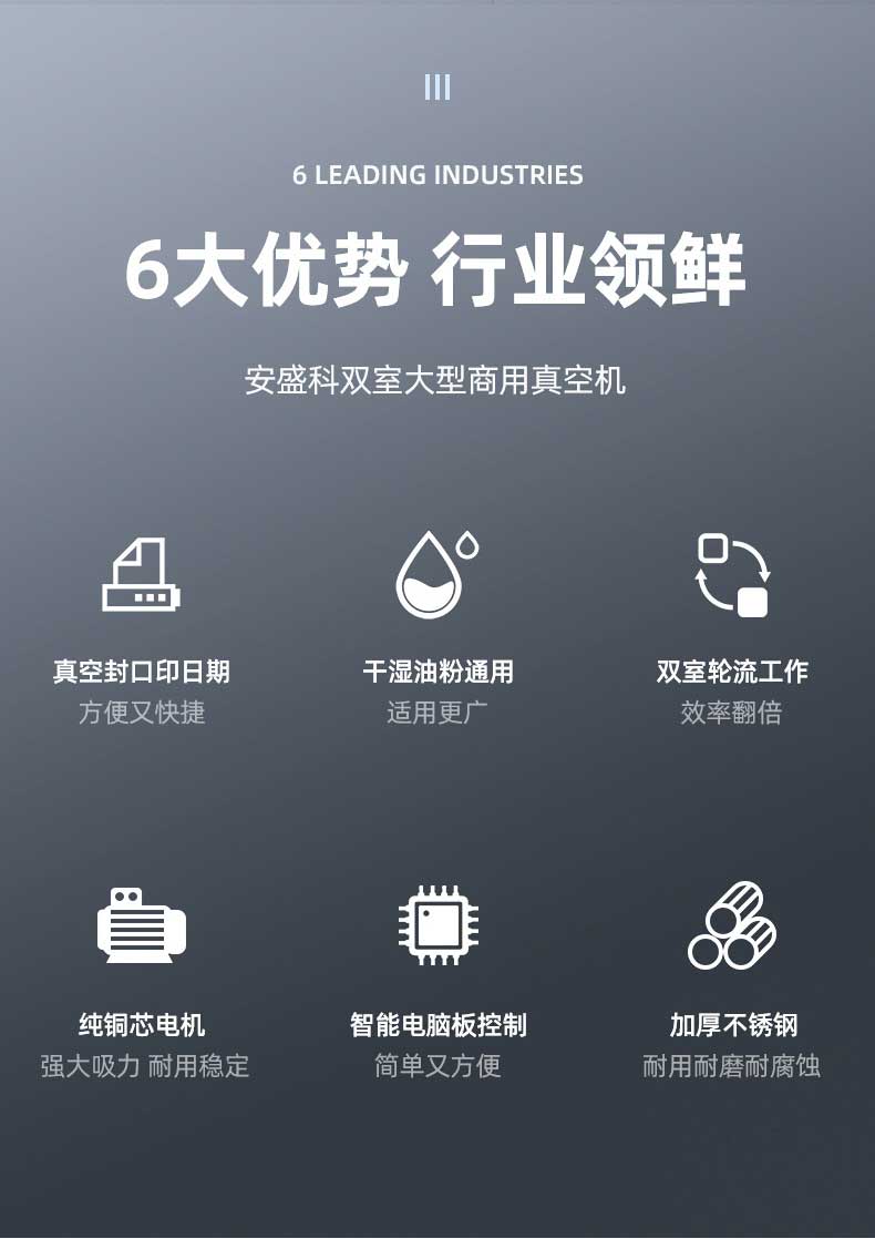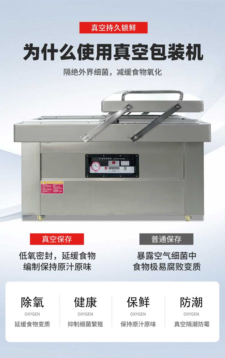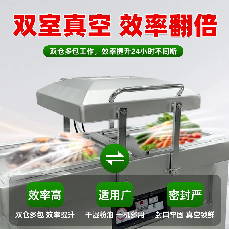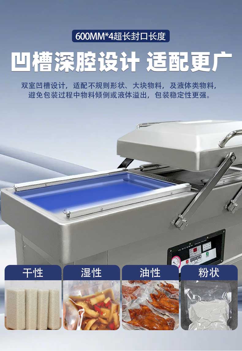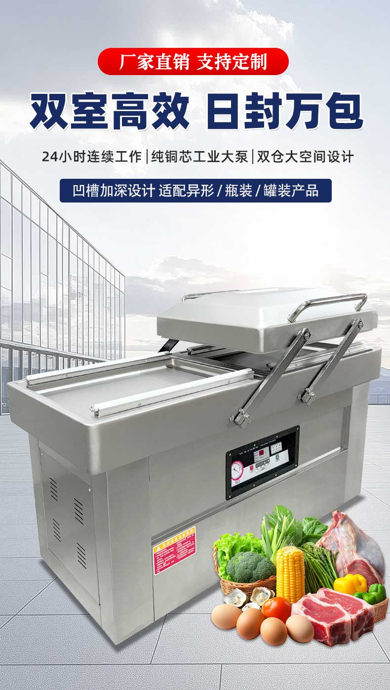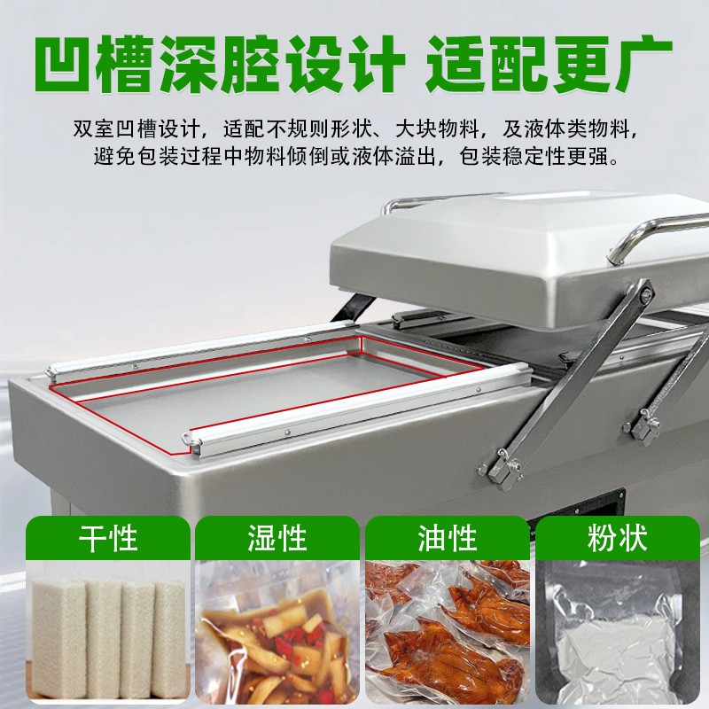 在鹵味飄香的熟食店、水產豐富的漁港作坊、預制菜量產的食品工廠中,帶湯汁、高水分產品的包裝始終是行業痛點——傳統真空機易漏液、效率低、保鮮差的問題,往往導致食材損耗、客訴頻發。雙室凹槽真空機專為這類產品量身打造,以“防漏鎖鮮+高效量產”為核心,通過結構創新與技術升級,成為鹵味、水產、預制菜行業的包裝利器。針對鹵味鹵汁、水產冰衣、預制菜湯汁等特殊屬性,設備在真空系統、密封結構、操作邏輯上實現全維度優化,從源頭規避包裝風險。