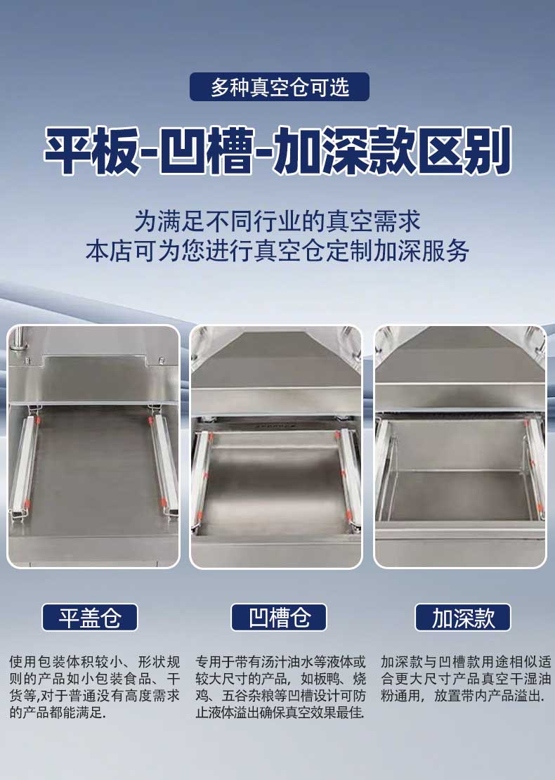 設備核心創新在于真空室的凹槽式設計,真空室內腔下凹深度可達10-40厘米(支持定制),鹵味拼盤、整只帶湯燒雞、大份預制菜等產品可垂直或傾斜放置,袋內湯汁自然匯聚于凹槽底部,與封口線形成安全距離。配合“液體防吸智能程序”,設備采用“先微壓排氣再深度抽真空”的梯度模式,緩慢排出袋內空氣的同時避免湯汁飛濺,解決了傳統設備抽真空時“噴液進泵”的維修難題。
