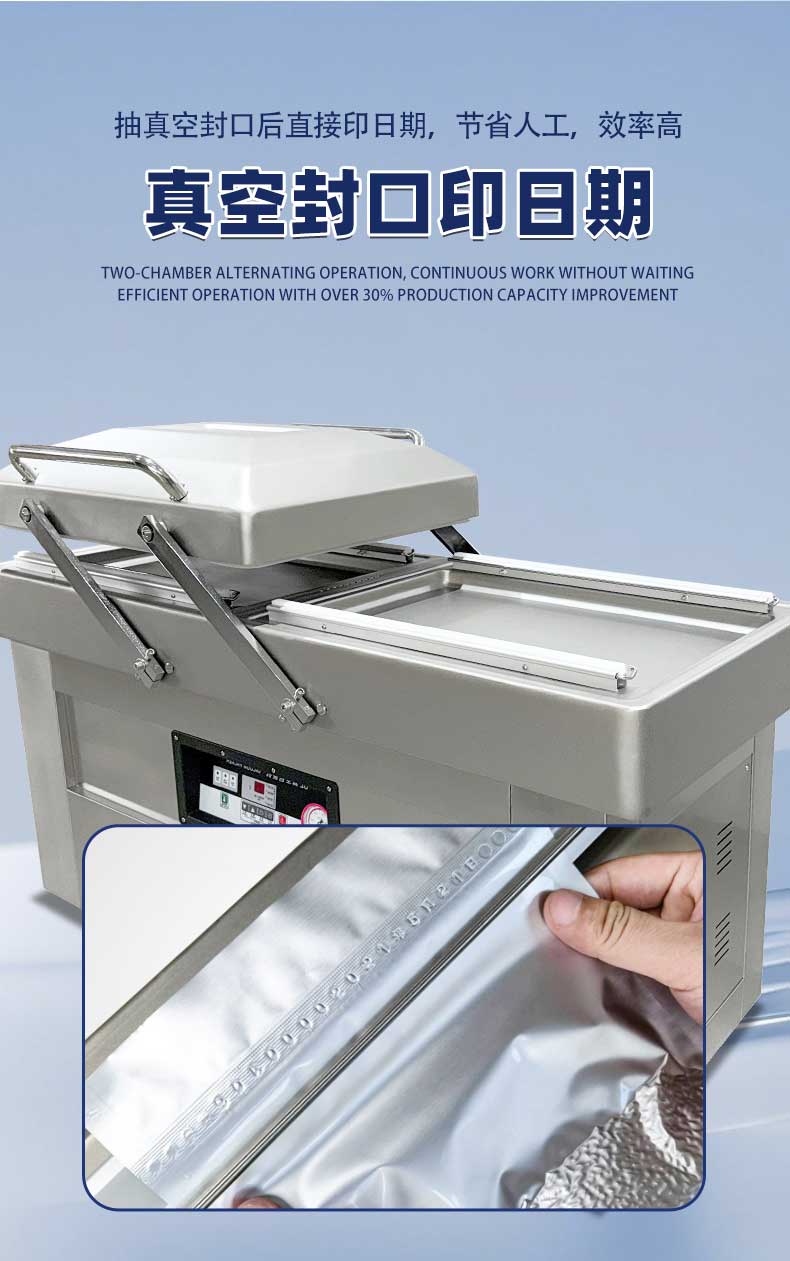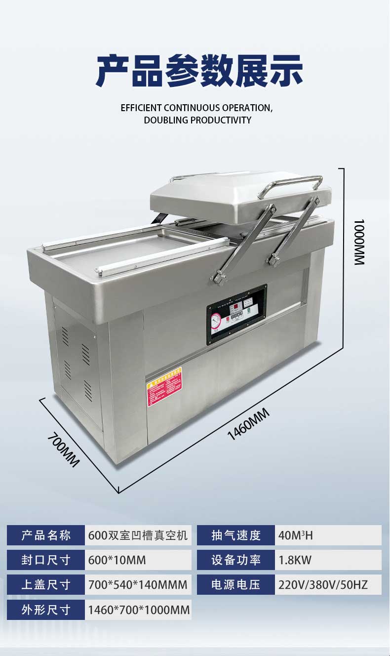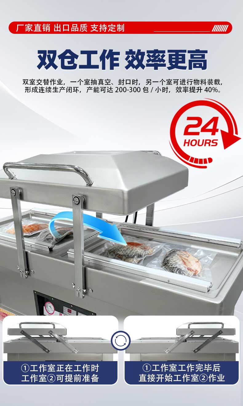 雙室結構是設備的效率核心——兩個真空室通過微電腦程序控制實現交替運作,當左側真空室完成抽氣、封口、冷卻的全流程時,右側真空室已完成物料擺放待命,真正實現“不停機連續工作”。搭配上海知名品牌大功率真空泵,雙泵獨立運作抽氣速率可達2×20m3/h,單室機每小時最多包裝160次。