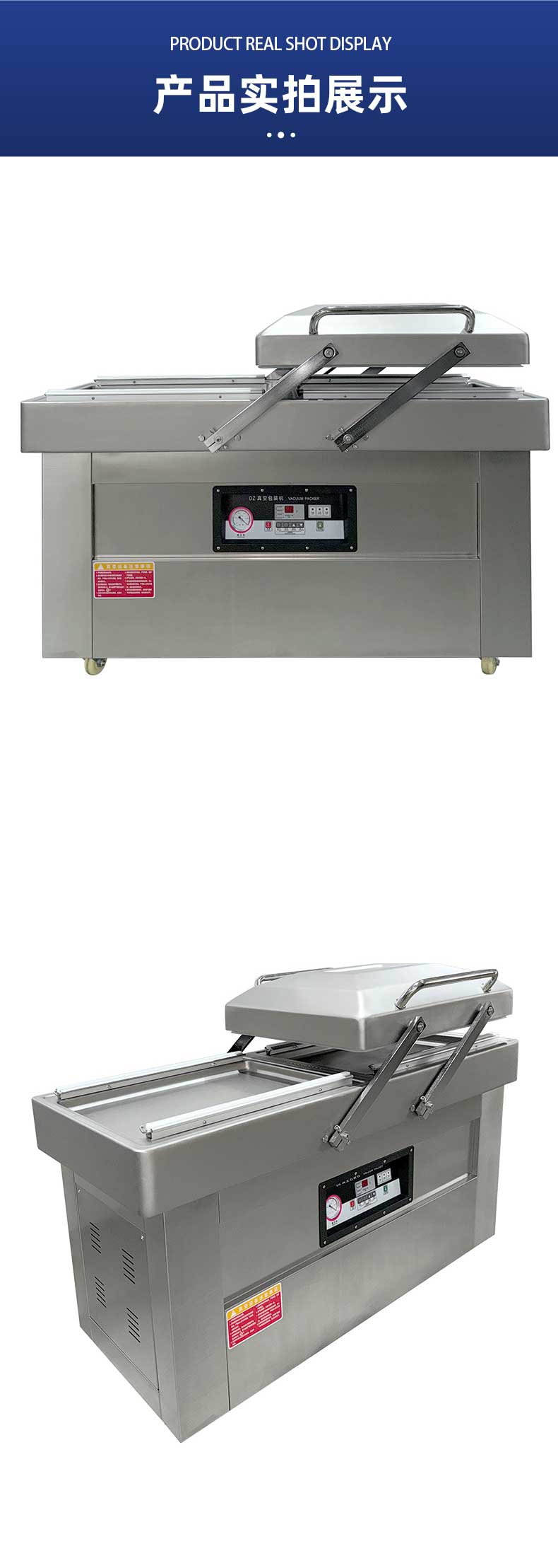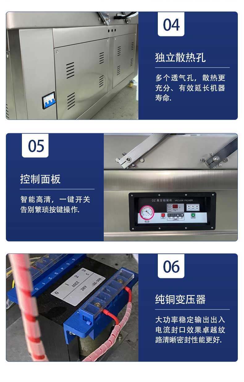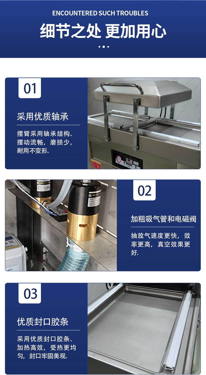 雙室結構是設備的效率核心——兩個真空室通過微電腦程序控制實現交替運作,當左側真空室完成抽氣、封口、冷卻的全流程時,右側真空室已完成物料擺放待命,真正實現“不停機連續工作”。搭配上海知名品牌大功率真空泵,雙泵獨立運作抽氣速率可達2×20m3/h,單室機每小時最多包裝160次。