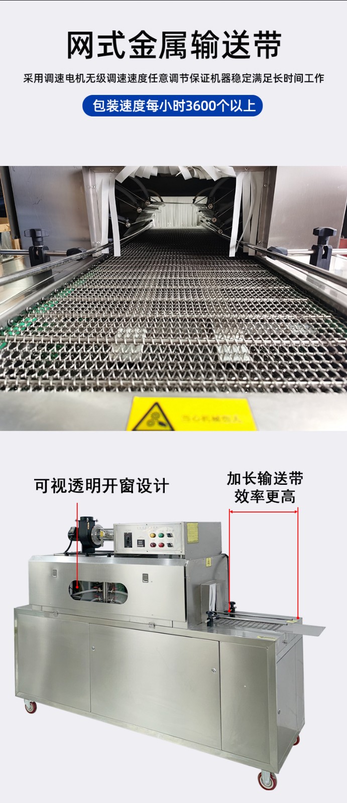 • 輸送系統(tǒng):用于將待包裝的產(chǎn)品輸送到蒸汽收縮區(qū)域,常見的有輸送帶、輸送鏈條等,材質(zhì)多為不銹鋼或其他耐高溫、耐腐蝕材料。